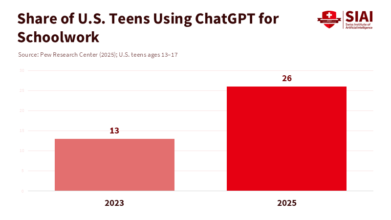 The most alarming number in today's classrooms is 49. Across OECD countries in PISA 2022, students who spent up to an hour a day on digital devices for leisure scored 49 points higher in math than those who were on screens five to seven hours a day. This gap approaches half a standard deviation, even after accounting for background differences. At the same time, one in four U.S. teens, or 26%, now uses ChatGPT for schoolwork. This is double the percentage from 2023. In simple terms, students are losing focus as finding answers has become effortless. When a system makes it easier to get a decent sentence than to think deeply, we can expect students to rely on it. The problem is not that kids will interact with an intelligent machine; it's that schoolwork often demands so little from them when such a machine is around.
