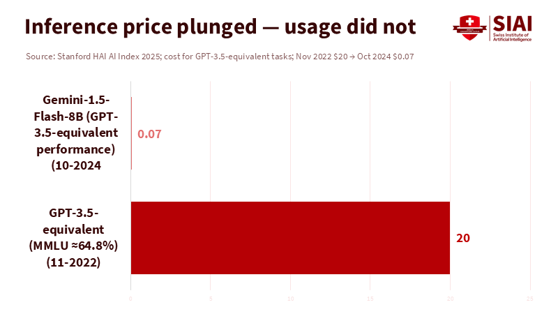 Stanford HAI. (2025). AI Index 2025, Chapter 1—Inference cost declines to ~$0.07/M tokens for some models.