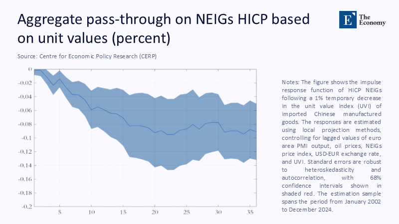 Central bankers often comfort themselves with the notion that goods tariffs exert minimal pressure on headline inflation because exporters absorb most of the hit. The euro-area data complicates that narrative. A CEPR panel regression finds that every ten-percentage-point rise in effective tariffs lifts the Harmonised Index of Consumer Prices (HICP) by roughly 0.2 percentage points within twelve months, even after controlling for exchange-rate shifts. The culprit is the efficiency loss in re-routing: extra container moves, additional paperwork, and duplicated quality checks add frictional costs that trickle into retail shelves. The aggregate pattern is mapped in Figure 2, which traces the impulse response of consumer prices to a one-percent change in Chinese export unit values.