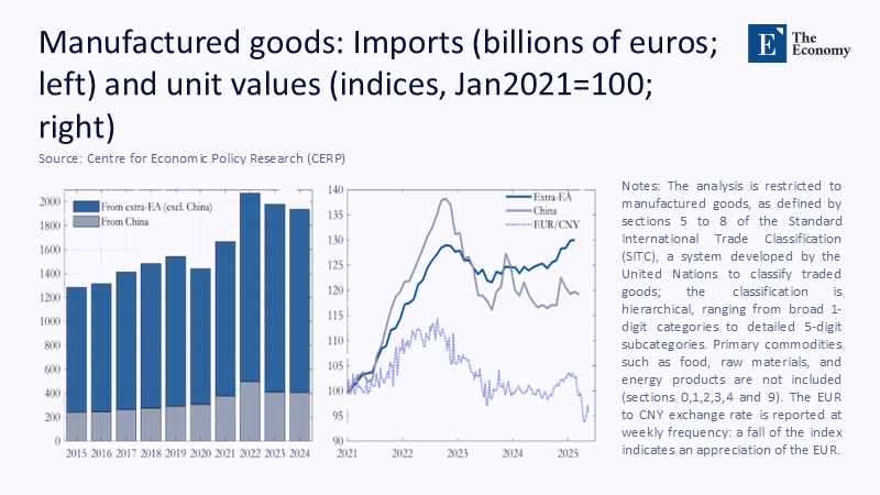 Figure 1 captures two dynamics defining the competitive imbalance: volumes of manufactured imports (left axis) and an index of unit values (right axis), normalized to January 2021 = 100. Chinese suppliers gain share even as their price index undercuts the rest of the world, underscoring how scale and subsidy reinforce each other.