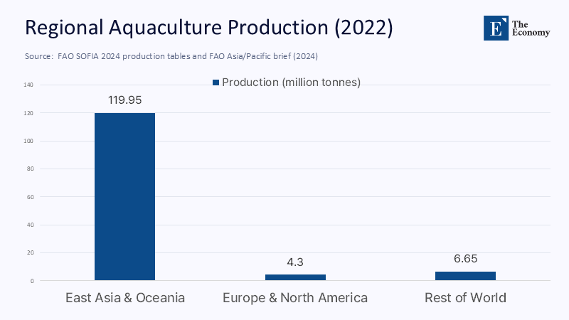 The State of World Fisheries and Aquaculture 2024 confirms that global aquaculture output hit an unprecedented 130.9 million tonnes in 2022, of which 94.4 million were aquatic animals rather than algae. Dig one layer deeper, and the center of gravity becomes starker: Asia alone produced 119.7 million tonnes—91.4% of the world total—while Oceania added roughly a quarter-million tonnes of high-value sashimi species. East Asia and Oceania accounted for almost 120 million tonnes, leaving a slender 4.3 million tonnes to Europe and North America and barely 7 million tonnes to the rest of the world. Those proportions look less like a growth spurt and more like a tectonic relocate­ment of comparative advantage when one recalls that the 2015 FAOSTAT baseline used in Naylor et al.’s Nature Communications model already showed the Indo-Pacific producing twice the farmed tonnage of the Atlantic economies. By 2024, the ratio had blown out to 4.3 to 1, confirming a structural-not cyclical—realignment that governs everything from feed-grain imports into Guangzhou to the cold-chain corridors piping live grouper from Palawan to Shenzhen at dawn.