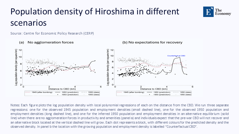 To better understand how civic expectations shaped spatial recovery, consider the contrasting scenarios modeled in Figure 2. When Hiroshima’s recovery is simulated under two counterfactuals—one with no agglomeration forces and one assuming no expectation of CBD recovery—the population density remains dispersed and fails to centralize. However, the 1950 data reflect a much more concentrated rebound, consistent with the hypothesis that collective belief in Hiroshima’s resurgence as a Peace City and policy reinforcement drove urban clustering back to the core.