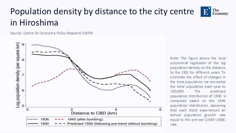 Quantitatively, the city rebounded with startling speed. By February 1946, Hiroshima's population had grown to approximately 146,000—nearly doubling from its immediate post-bomb low of 83,000. Over the next decade, Hiroshima recovered its pre-war population of 350,000 and exceeded it. International aid played a role: the Hiroshima Peace Center and various foreign-funded initiatives boosted recovery and symbolism simultaneously. Notably, the Japanese state invested in making Hiroshima a "moral capital," even as Tokyo remained the administrative one. This branding—conveyed through educational curricula, commemorative events, and foreign diplomacy—generated substantial economic benefits, particularly through tourism and international conferences. However, this resurgence wasn’t merely symbolic or policy-driven—it was spatially visible in how population patterns were reconstituted around Hiroshima’s pre-war urban core. As shown in Figure 1, the population density by distance from the central business district (CBD) reveals a striking trend: while the 1945 pattern shows a population vacuum at the city center, by 1950, Hiroshima’s density had returned toward a near pre-war configuration, especially within 2–3 km of the CBD. This strongly suggests that the city’s decision to memorialize its center, rather than relocate or decentralize, played a pivotal role in accelerating population re-agglomeration. By the 1990s, Hiroshima received more than 1.5 million domestic and international visitors annually, many drawn by its symbolic status and memorial infrastructure.