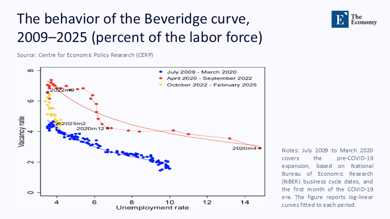 Figure 2: Post-2022 data points sit far above the pre-pandemic Beveridge curve, signaling lingering labour-market tightness despite falling vacancies.