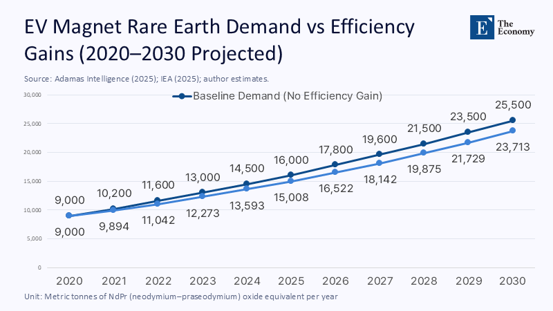 Figure 2: Modest annual efficiency gains in magnet design could cut EV rare-earth demand by 30% by 2030, easing pressure on global supply.