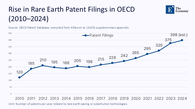 A new VoxEU column by Alfaro, Fadinger, Schymik, and Virananda parses patent filings in 52 countries and matches them to calibrated input-output tables. Industries that sat one standard deviation above the mean for rare-earth intensity in 2010 registered a half-percentage-point annual jump in total-factor productivity after the shock relative to their less-exposed peers. Crucially, the productivity surge materialized outside China, corroborating a directed-technical-change model. This model suggests that pain, not comfort, propels experimentation and innovation in times of scarcity.