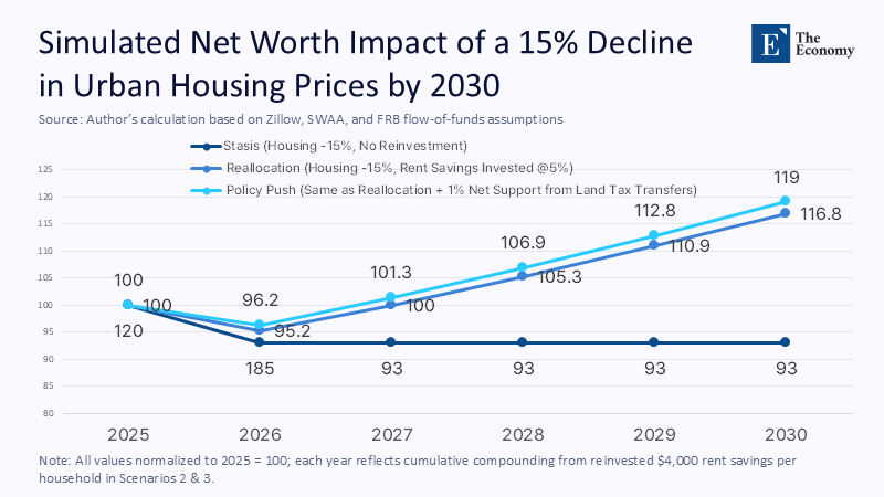 The Federal Reserve’s Distributional Financial Accounts show that Millennials and Gen Z allocate only about 23% of their assets to housing, in stark contrast to Baby Boomers, who had over 40% in home equity at the same age. At the same time, automatic 401(k) enrollment funnels younger workers into low-cost index funds—risk assets that still enjoy a historical 7% real return. If urban home prices shift from a twentieth-century norm of 4% annual appreciation to a post-WFH glide path of 2%, the crossover point at which equities outperform housing compresses to under a decade. The Wall Street Journal already records a widening ownership gap as high mortgage rates freeze would-be first-time buyers out of metropolitan markets. Yet paradoxically, that exile may shield them from the capital-loss cycle about to hit aging homeowners whose wealth is tied up in a suddenly devalued zip code.