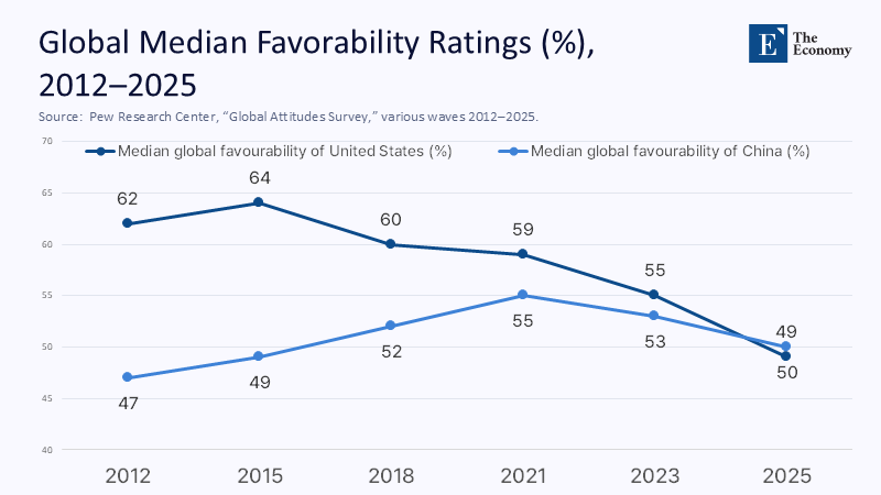 Hard-power superiority traditionally masks softer vulnerabilities, yet attitude surveys reveal attrition long before weapon systems lose edge. Pew’s June 2025 poll across twenty-four countries registers a dead-even split: 49% view the United States favorably, and 49% do not—the worst median reading in two decades and a full twenty-point slide since 2021.