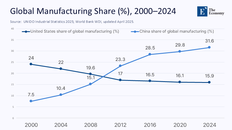 In 2000, the United States accounted for one-quarter of global manufacturing value-added. By 2024, its share had slipped to 15.9%—less than half of China’s 31.6%. UNIDO baseline projections, replicated by the Information Technology and Innovation Foundation, show the US slice falling to 11% by 2030 while China approaches 45%. The numbers matter because manufacturing retains the economy’s highest research spillover multiplier and anchors 55% of merchandise exports.