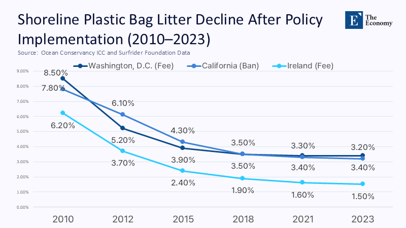 Ireland’s pioneering €0.15 levy in 2002 (raised to €0.22 in 2007) is a prime example of how a well-implemented fee can drastically reduce plastic bag consumption. This levy, which was introduced as a part of the Waste Management (Amendment) Act 2001, led to a 90% reduction in bag consumption within six months. According to Environmental Protection Agency field audits, it also cut average beach-litter counts from 17.7 to 5.5 bags per 500 meters. This success story from Ireland demonstrates the potential of a well-designed fee system in reducing plastic bag usage and litter. England’s 5-pence charge—later doubled to 10-pence—drove usage among major retailers from 7.64 billion bags in 2014 to 79 million in 2024, a 98-percent collapse without a single criminal summons. Uruguay opted for a hybrid, mandating biodegradable bags and adding a four-peso fee that knocked national demand down by 80% within weeks of launch. None of these jurisdictions paid for legions of inspectors; shoppers performed the enforcement once the price crossed a trivial psychological threshold. By contrast, cities that jumped directly to blanket bans—Cape Town in 2003, for instance—ended up in costly court fights and black-market loopholes that erased much of the environmental benefit.