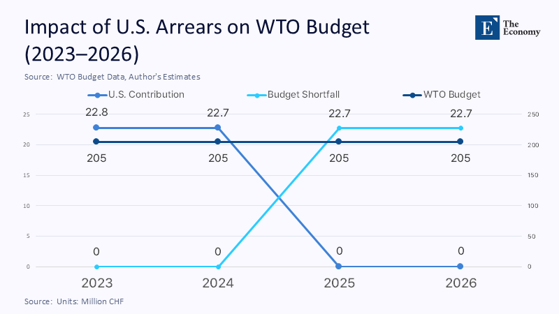 Figure 1: As US contributions fall to zero from 2025, the WTO faces a cumulative budget shortfall exceeding CHF 45 million—disrupting operations, staffing, and technical assistance.