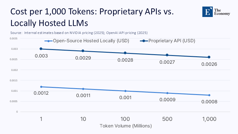 Cost curves are equally salient. Training a 65-billion-parameter model on 256 H100s now finishes in eight weeks. All-in compute, and power outlays amount to nearly US $12 million; amortized over three years of daily inference, the cost per thousand tokens drops well below half a US cent. Proprietary APIs, by contrast, still retail above USUS$ 0.003 per thousand tokens for comparable model classes, leaving a price umbrella ripe for undercutting.