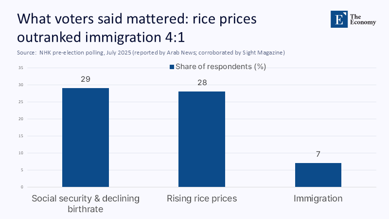 In the final week before Japan’s July 20, 2025, Upper House election, NHK polling found that 28% of voters named soaring rice prices as a top concern; immigration ranked joint fifth at just 7%. In the same vote, the governing coalition lost its majority and a small right‑populist party vaulted from one to 14 seats in the 248‑member chamber—headline‑grabbing, yes, but still marginal in legislative heft. Rice prices have roughly doubled over the past year, the yen is weak, and core inflation has sat above the Bank of Japan’s 2% target for more than three years. Add a grinding political‑funding scandal and a prime minister fighting to keep his job, and the electoral arithmetic looks less like a xenophobic turn and more like a price‑shock verdict delivered to an enfeebled ruling party. The message from voters was not “keep foreigners out,” but “fix the economy and restore trust.”