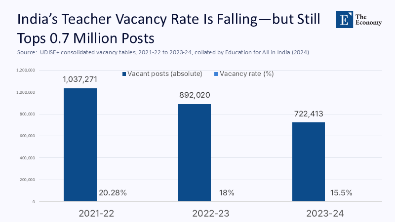 Vacancy rates fell from 19.7% in 2021 to 15.1% in 2024; however, this still leaves more than one million unfilled positions, with a significant shortfall in language and STEM fields. The latest UDISE+ dashboard counts 98 lakh teachers nationwide; bringing every school to the Right-to-Education PTR would require roughly 150,000 additional hires before we even ask them to deliver trilingual instruction.