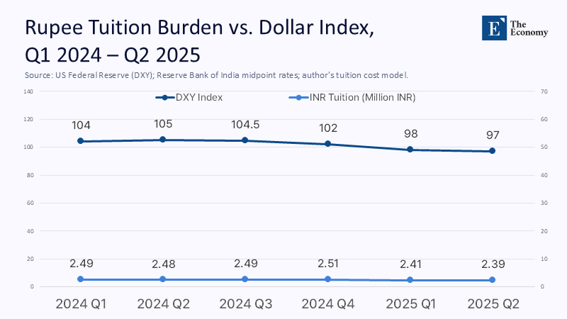 While complex numbers abound for reserves and payments, education-specific currency exposures are scattered. We, therefore, estimated them using UNESCO’s cross-border student mobility tables, matching sending-country flows with the average published tuition in host currencies and then applying annual foreign exchange movements to infer potential gains or losses. The approach inevitably approximates that many discounts, private transfers, and informal remittances go unreported. Yet even a conservative pass suggests that a single-year 6% drop in the dollar (as in early 2025) lifted the local currency cost of a U.S. study for Indian families by $940 per undergraduate—roughly one-fifth of India’s median per capita income. That is not a rounding error; it is a barrier to human capital formation.