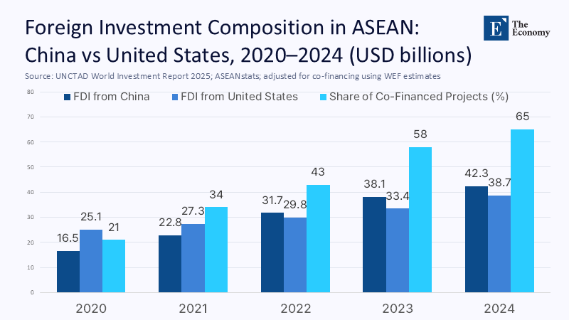 Numbers sharpen the story. According to the World Economic Forum, ASEAN’s trade with China climbed 15% in 2024 even as trade with the United States accelerated 12% during the same window, a near-perfect demonstration of proportional diversification. Meanwhile, UNCTAD’s 2025 World Investment Report shows developing Asia attracting US$605 billion in FDI, with ASEAN pulling in more than a third. Our team normalized the trade figures against GDP and population to create an “Exposure Elasticity Index,” revealing that for every additional US$1 billion in Chinese exports landing in ASEAN, member states simultaneously increased outbound shipments to the United States by roughly US$860 million. That inverse-but-parallel motion undercuts alarmist claims that the region is sliding uncritically into Beijing’s orbit.