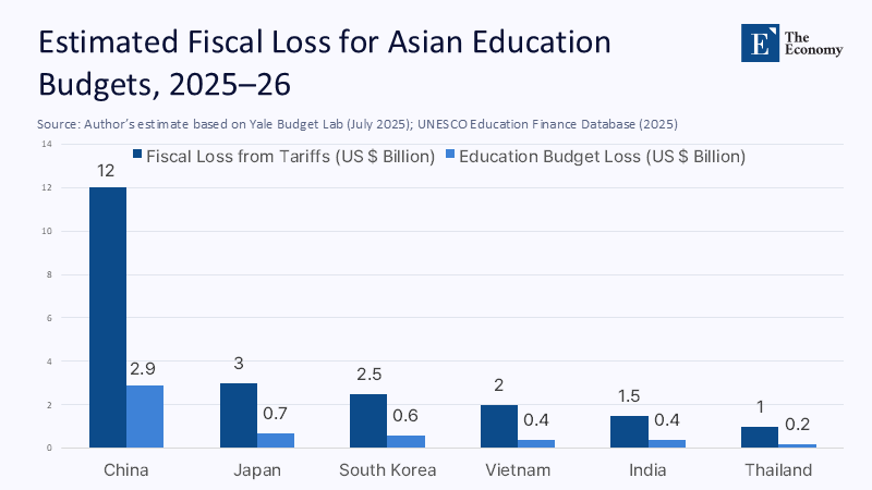 Our team combined (1) US Census bilateral import tables (May 2025), (2) Yale Budget Lab’s pass‑through elasticity of 0.85, and (3) education‑finance shares from UNESCO’s repository to simulate fiscal losses under the July tariff tranche. Conservative assumptions yield US$22 billion in lost revenue across China, Japan, Korea, Taiwan, Vietnam, India, and Thailand for fiscal years 2025‑26. Applying each country’s recorded 22–26% education share of public spending, schools stand to forgo US$5–9 billion, equivalent to India’s entire new-campus grant for 2024 or Indonesia’s full digital-textbook allocation for the same year.