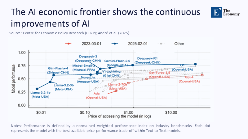Skeptics counter that perfect competition remains a mirage because quality ceilings continue to rise. Yet the data betray a convergence trend governed by diminishing returns to parameter count. OpenLM Research tracked 43 model releases from May 2024 to May 2025 and found that beyond approximately 70 billion parameters, gains in MMLU or GSM-8K benchmarks flatten to less than 1% per doubling of compute. In practical terms, algorithmic novelty—retrieval‑augmented generation, data‑centric training, sparse mixtures—outpaces brute‑force scale. That dynamic operates much like strategic tradeoff models, in which firms choose either high quality or low cost. When technological diffusion erodes the quality frontier, the payoff matrix collapses into pure price rivalry.