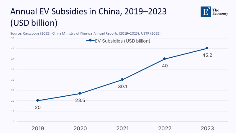 Quantifying the lattice is messy, yet fragments converge once open‑source disclosures, bond prospectuses, provincial budgets, and customs data are triangulated. Between 2009 and 2023, Beijing invested at least US$230 billion in the EV ecosystem—US$45.2 billion in 2023 alone—through buyer rebates, VAT exemptions, upstream battery grants, and land leases. Huawei, portrayed abroad as an employee-owned innovator, received more than US$1 billion in direct government grants in 2023, quadrupling its 2019 haul, while local governments injected land and cash to keep its chip arm afloat. Parallel flows run through critical-mineral exploration, where provinces now devote ¥100 billion a year to subsidies and more straightforward land conversion.