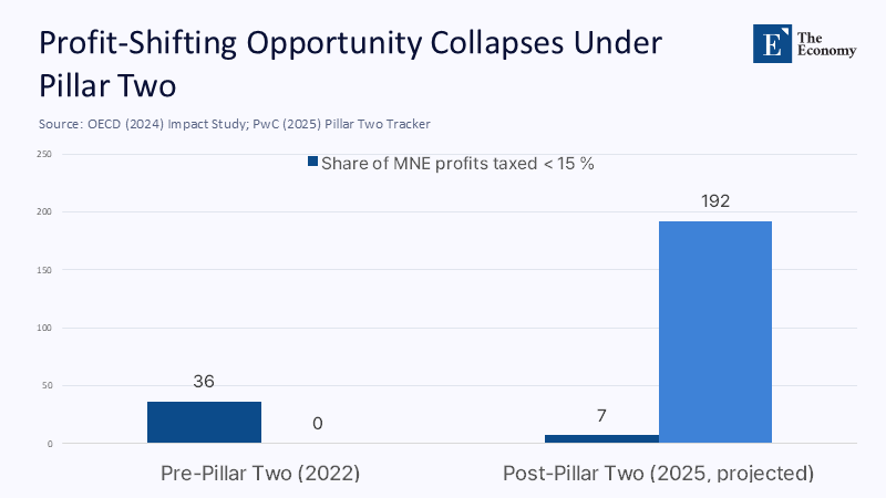 Fresh quantitative evidence reinforces the shift. The OECD's January 2024 impact study projects that, once Pillar Two beds in, the share of global profits taxed below the 15% rate will collapse from 36% to just 7%—a drop of roughly 80%—while annual corporate‑tax revenue rises by up to US$192 billion. Put differently, the pool of arbitrage opportunities is shrinking almost as fast as compliance exposures are multiplying.