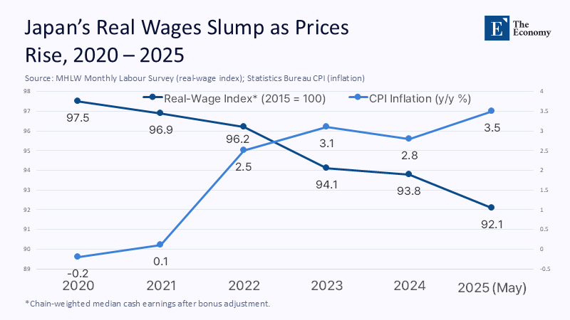 Three and a half percent: that single statistic — Japan’s year‑on‑year consumer‑price inflation in May 2025 — has been brandished by pundits as proof that the nation has finally escaped its three‑decade deflationary trap. Yet the very same data release records a chilling counterpoint: real wages fell 2.9%, marking the fifth consecutive drop and the steepest in almost two years. Combine the two numbers, and households have forfeited roughly six percentage points of purchasing power in twelve months, the fastest compression in the post-war era. Shoppers feel the pinch at supermarket tills, where they quietly trade sushi‑grade tuna for canned mackerel; department‑store managers report discretionary sales still 14% below their 2019 level. The lived economy, in short, looks nothing like a victory lap. Japan has succeeded in rekindling inflation; it has yet to revive demand.
