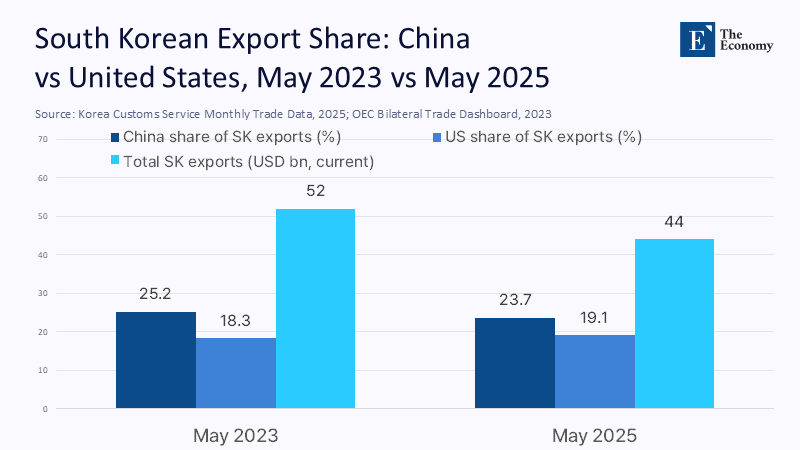 Quantitatively, Seoul’s tilt is already traceable. In May 2025, exports to China fell 8.4% year‑on‑year to $10.4 billion, yet China still absorbed nearly one‑quarter of Korean shipments, four points more than the US share. Semiconductor dependency deepens the bind: chips made up 21% of all Korean exports in 2024—$142 billion—of which China accounted for the most significant single slice. Meanwhile, Beijing’s defense budget climbed another 7.2% this March to 1.79 trillion yuan ($247 billion), outpacing GDP and marking its tenth consecutive year of single‑digit but compound growth.