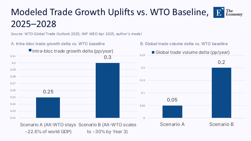 Consider two scenarios. In Scenario A, an EU‑Japan‑UK‑plus bloc representing 22% of world GDP achieves average intra‑bloc tariff reductions of 5 percentage points relative to the post‑Trump baseline and modestly harmonizes non‑tariff measures in digital services and green goods. Using the WTO’s April 2025 world merchandise trade growth forecast of 3.2% for 2025–2026 as a baseline, such a bloc could plausibly add 0.2–0.3 percentage points to its internal trade growth annually, owing to lower border frictions and regulatory certainty; the aggregate effect on global trade volumes, however, would be muted—perhaps 0.05–0.1 percentage points—because of the bloc’s smaller global weight. In Scenario B, the same bloc’s rules are designed as open protocols. Over three years, it onboards middle‑income adherents representing an additional 6%–8% of global GDP—think Korea, some ASEAN economies anxious about tariff crossfire, and parts of Latin America. The bloc’s gravitational mass rises to around 30%, and the global trade impulse becomes non-trivial, potentially 0.2 percentage points. These are conservative estimates: I assume pass-through elasticities from tariff cuts to trade volumes of 0.6, non-tariff measure equivalence reductions worth 1–1.5 percentage points, and a zero multiplier from dispute-settlement predictability in the first two years. If I am wrong, it is likely on the upside; certainty tends to have lags, followed by step changes.