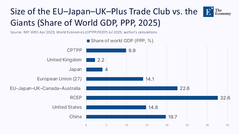 Let us be brutally empirical. Combine the EU’s 14.1% share of global output (PPP) with Japan’s roughly 4% and the UK’s ~2.2%, plus Canada and Australia, and an “Alt‑WTO” anchored around these economies might reach approximately 22%–24% of world GDP—respectable, but well below either RCEP’s 32.6% or the combined heft of the United States and China. The CPTPP accounts for just 9.9% of global GDP in 2025, a sharp reminder that high-standard clubs can be economically slender. Even if a Europe‑led “structured trade cooperation” with Asian democracies materializes—as floated by the European Commission in June—it will confront a scale problem: rules without mass are aspirational; rules with mass are magnetic. My back‑of‑the‑envelope calculation assumes IMF 2025 PPP shares, with Japan at roughly 4% (derived from its nominal $4.19 trillion economy, adjusted for PPP ratios historically around 1.6–1.7) and the UK at just over 2%. The precise numbers will fluctuate with exchange rates and revisions, but the strategic conclusion remains unchanged: without Washington or Beijing, an EU-Japan-UK-plus coalition cannot “replace” the WTO; it can only prototype a regime so obviously functional that others will eventually incur the switching costs to join.