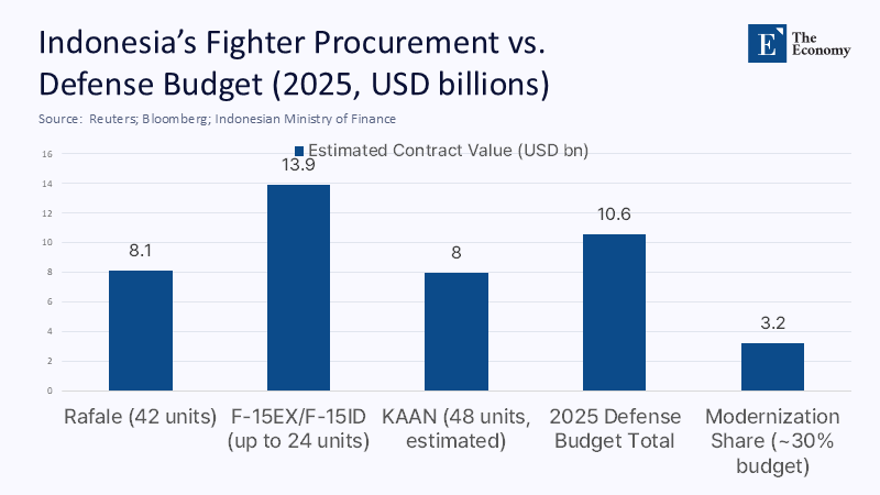 Affordability is not a slogan; it is math. Start with procurement. Rafales: $8.1 billion for 42 aircraft, delivery of the first six expected in early 2026. F-15EX: The U.S. approved a package valued up to $13.9 billion; the flyaway cost for recent U.S. lots is about $90 million per jet. KAAN: a signed Indonesian contract for 48 aircraft, with no official price disclosed, plausibly implies multi-billion-dollar exposure across development and sustainment. Now add operations. France’s 2024 Senate report puts the Rafale’s flying-hour cost at roughly €25,000; U.S. DoD FY2024 reimbursable rates list the F-15EX at about $16,000–$17,000 per hour, excluding many ownership overheads. Stack those lifecycle costs against a 2025 defense budget proposal of IDR 165.2 trillion (~$10.6 billion), more than half of which typically goes to personnel and management support, with modernization a minority share. The budget ceiling is absolute; the physics of sustainment are unforgiving. Buying three overlapping fighter ecosystems under such constraints is not prudent hedging; it is structural overreach.