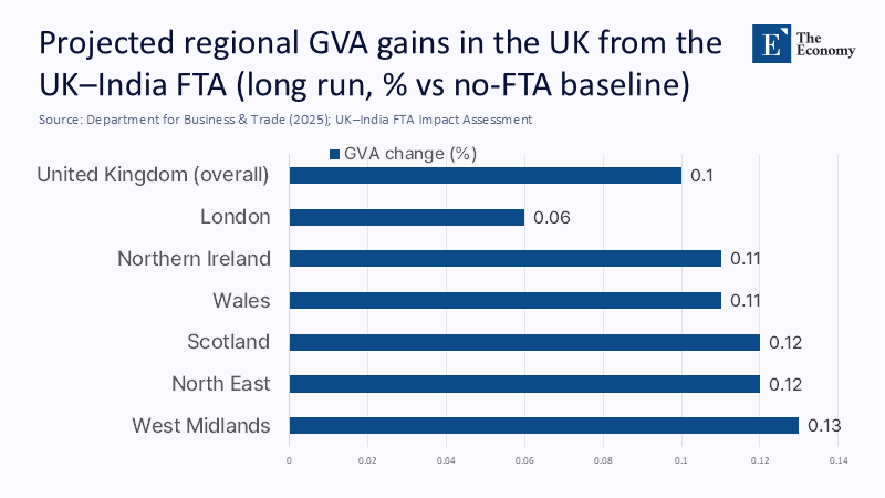 Critics focus on import competition in visible consumer sectors, but the less visible channel is more powerful. UK firms buy a rising volume of Indian services as intermediate inputs—IT, design, back-office, analytics. When those inputs get cheaper and more predictable, British output per hour improves and export prices fall, which is exactly how small and mid-sized manufacturers expand in tough global niches. The impact assessment captures this compounding effect: UK exports to India are projected to rise nearly 60% in the long run, with the most significant gains in machinery and equipment, chemicals and pharmaceuticals, motor vehicles, and beverages. These sectors anchor regional clusters, from the West Midlands’ auto supply chain to Scotland’s spirits ecosystem, meaning the benefits spread beyond the M25.