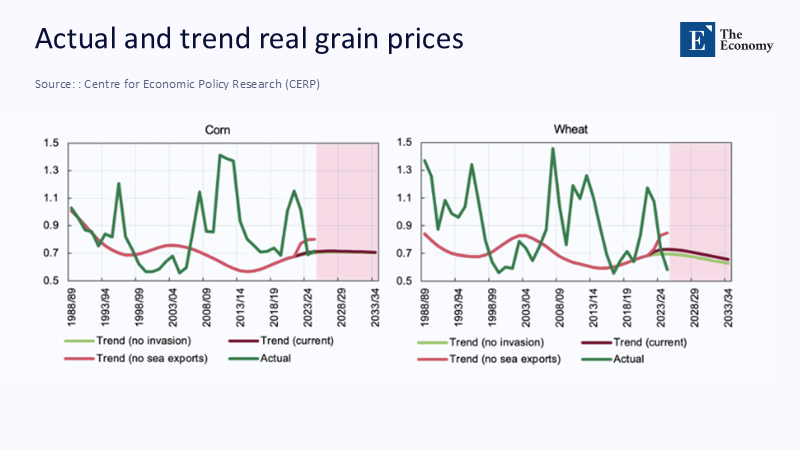The production math is unforgiving. USDA data show Ukraine's harvested wheat area falling from roughly 7.4 million hectares in 2021/22 to about 5.0–5.5 million hectares since, with output settling near 22–23 million tons—about a third below the 2021 record. That gap equates to several percentage points of world export availability, given Ukraine's pre-war ~10% share of global wheat trade. Global supply elsewhere has responded—South American maize and North American spring wheat, for example—but the world is now clearing at a higher marginal cost. Commodity sheets show U.S. HRW and SRW wheat prices in 2025 well below 2022's2022's panicky highs yet not anchored to 2019's low base, and international outlooks still project record cereals with inventories tight by historical standards. In other words, headline abundance coexists with a new geography of risk. The trajectory has changed: empirical work flags that post-invasion dynamics continue to push both level and variance above the old track. A peace agreement would ease volatility; it would not conjure land, labor, and logistics back to 2021 conditions overnight.