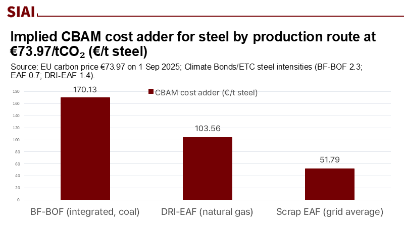 The usual story casts CBAM as a tariff in green clothing. The more realistic reading is that CBAM internalises climate risk while creating an operational moat for producers who move fastest on process efficiency and clean power. Europe’s design deliberately mirrors the EU Emissions Trading System (ETS): in the definitive regime from 2026, importers pay a carbon price aligned with the weekly average ETS auction price, while free allocation to European producers is gradually phased out. That symmetry—price inside the border, price at the border—solves the classic competitiveness objection and, if anything, over time sharpens the incentive to invest in low-emission routes such as scrap-based electric-arc furnaces (EAFs) and direct-reduced iron (DRI) with green hydrogen.