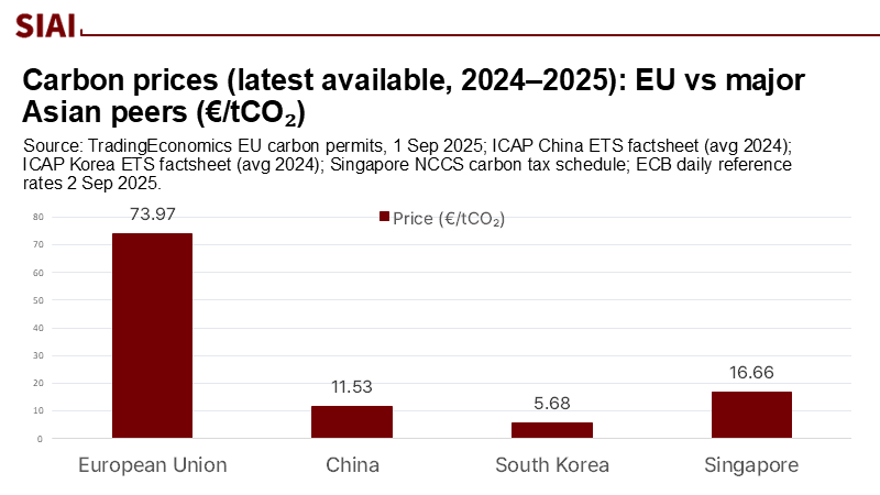 The dispersion is stark. Korea’s permits traded in the single digits of US dollars through 2024–2025; China’s national allowance averaged roughly 98 yuan (~€13) in 2024; Singapore’s statutory levy, though rising, is effectively lower for some emissions-intensive trade-exposed firms due to rebates; Australia’s reformed Safeguard Mechanism is tightening baselines by ~4.9% a year with a default compliance unit price around A$36. None of these instruments yet delivers an EU-scale marginal abatement signal. Still, they are moving in the right direction—and, critically, they allow Asian exporters to claim credits against CBAM for domestic carbon costs paid, lowering their net duty at the border.