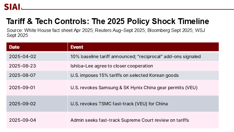 What makes the current thaw between Tokyo and Seoul distinctive is not the warmth but the logic behind it. In late August, the two leaders issued their first joint statement in 17 years, explicitly calling each other “partners” and pledging “future-oriented” cooperation. The symbolism was hard to miss: Lee made Tokyo his first major stop before Washington, and his Liberation Day remarks framed Japan as an indispensable neighbor. Ishiba, bruised by summer electoral setbacks and accusations at home that he is too soft on China, nonetheless took the bet that stabilizing ties with Seoul would reduce strategic isolation as Washington’s trade policy turned more transactional. The arithmetic favors coordination: if historical grievances can be bracketed, both countries can negotiate export-control carve-outs, align their tariff hedges, and avoid undercutting each other in U.S. talks. This is not ideological rapprochement; it is crisis management driven by the tariff meter and the fear of waiver revocations on the very technologies—lithography tools, specialty chemicals, and high-bandwidth memory—that anchor their growth strategies. The fragility is equally apparent. Ishiba’s standing is contested and may not endure, while Lee, despite an early mandate, will face domestic temptations to mobilize anti-Japan sentiment if growth wobbles. For now, the détente holds because the costs of failure—squeezed margins in the U.S. and operational drag in China—are higher than the political pain of compromise.