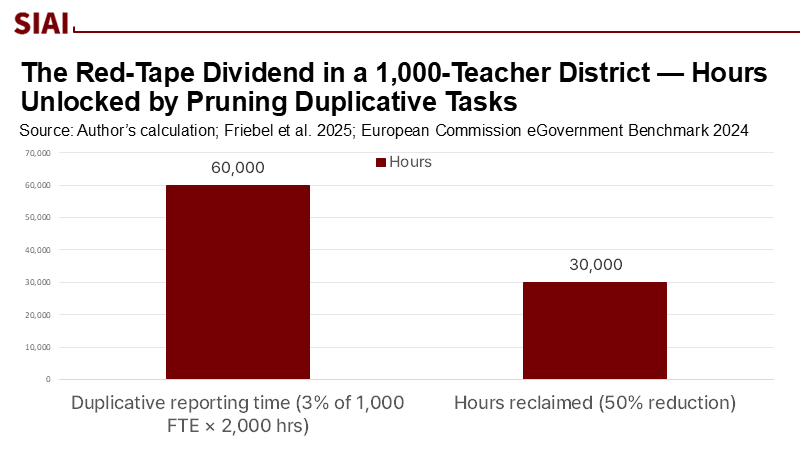 Start with a conservative thought experiment. Suppose teachers and school leaders spend 3% of working time on duplicative reporting—double entry, uploads to multiple portals, forms that ask for data the state already has. In a district with 1,000 full-time educators working 2,000 hours a year, that is 60,000 hours of compliance. Reclaiming even half yields 30,000 hours—roughly 18 full-time equivalents—available for small-group instruction, student feedback, or mentoring. Method note: hours = FTEs × annual hours × burden share × reclamation rate = 1,000 × 2,000 × 0.03 × 0.5 = 30,000. The salary money already exists; the dividend materializes when we eliminate work that does not need to be done.