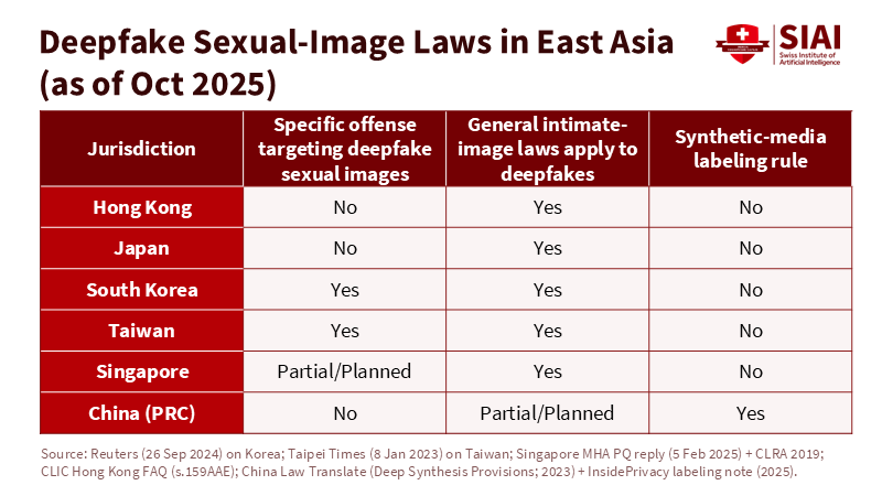 This patchwork system is particularly relevant for universities that have students from diverse countries, utilize cloud storage, and rely on platforms based outside their own institutions. Hong Kong adheres to general laws governing offenses and data privacy. Japan typically uses defamation or business obstruction laws to target those who spread content, leaving non-distribution harms in uncertain areas. Singapore is working to clarify that sexually explicit deepfakes fall under existing laws and has already tightened rules during election periods and for online harms. The landscape is inconsistent, and students suffer as a result.