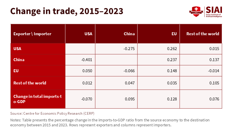 The main question in recent discussions is why the feared impact on welfare from decoupling has been smaller than expected so far. The answer lies in timing and composition. Between 2015 and 2023, the geography of trade shifted into blocs, but overall diversity and volumes remained stable. Countries traded less with adversaries and more with allies, while many remained “unaligned,” navigating between blocs. A new multi-country model using bilateral flows from 2015 to 2023 shows that the median country experienced a slight rise in real income as trade reoriented. This happened because higher costs on one route were balanced by cheaper alternatives elsewhere. In short, the past decade saw decoupling without deglobalization, which limited short-term harm to trade decoupling welfare.