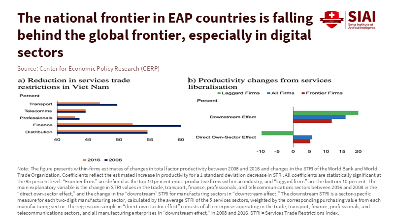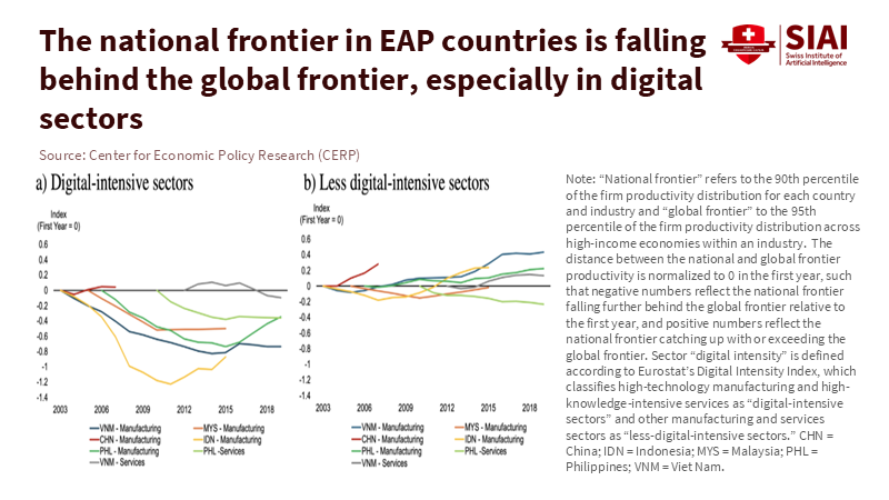 To understand why top firms are falling behind, we need to change our focus from "how much support" to "how support influences allocation." Throughout the region, the gap between national leaders and the world's best firms has grown, especially in digital manufacturing. Between 2005 and 2015, productivity at the global frontier of digital manufacturing surged by 76%, while the frontier in Indonesia, Malaysia, the Philippines, and Viet Nam increased by only about one-third during the same period. This gap didn't result from a lack of capital or talent. It stemmed from incentives that reduced the drive to shift market share and resources to the most efficient producers. When industrial subsidies in East Asia favor established companies, they reduce the cost of maintaining size rather than improving quality.