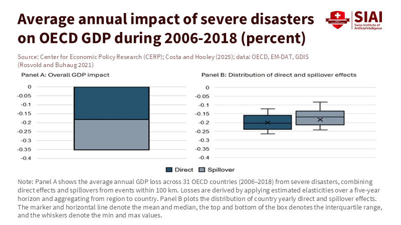 Recent research across advanced economies estimates that extreme weather leads to annual output losses averaging about 0.3% of GDP. Roughly half of that loss occurs outside the disaster area due to negative spillovers. This is not an outlier result; it aligns with new spatial studies that find measurable output declines in nearby regions even if they escape direct damage after a severe disaster. Losses can also linger. Current estimates suggest multi-year impacts on regional GDP following the initial shock. Simply put, climate spillover costs arrive quickly, spread widely, and stick around. Policymakers focusing only on direct damages will consistently fall short.